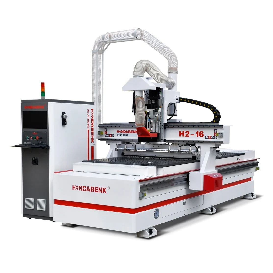 Model H2-16 X-Y-Z axis working area 1,220 x 2,440 x 200mm Machine size 2,100 x 3,800x2300mm Repositioning resolution 0.02mm X-Y movement rack and pinion, gear drive Z movement ball screw drive/Taiwan Guide Linear 25 square/Taiwan Max. speed